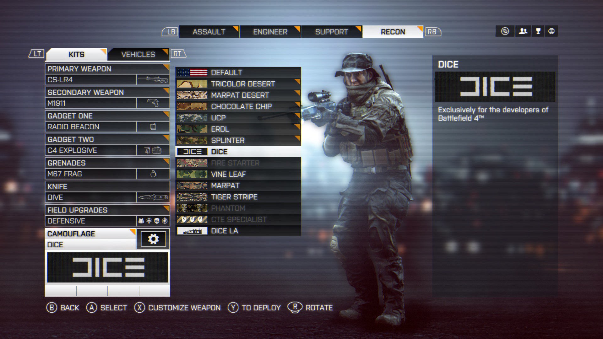 Teki On Twitter Bf4 数年の時を経て ついにdice迷彩の解除方法が発見された模様です Dice La迷彩の解除方法が確立された時 Dice迷彩もできるのでは と考えられ開発者もそれを仄めかしていましたが今回正式に確認された形です 解除場所はイースターエッグではお