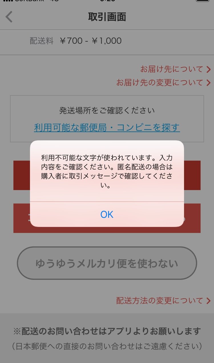 ちびうさ 無給兎ブロガー On Twitter 通勤前にゆうゆうメルカリ 便を発送しようとしたらこんなエラーが出て発送シール印刷できない 購入者の方が住所や名前に使用不可の文字を使ってるとゆうゆうメルカリは使用できないみたいです これ2回目なので対応策