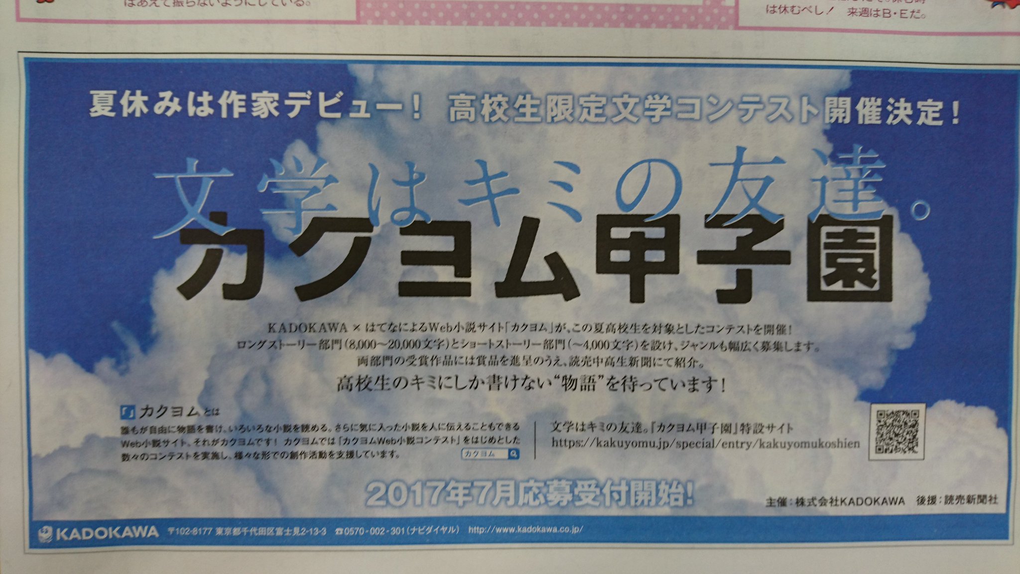 読売新聞社広告局 On Twitter 高校生のあなた この夏作家デビューのチャンスです Web小説サイト カクヨム が 高校生限定の文学コンテストを開催 受賞作品は読売中高生新聞にて紹介されますよ カクヨム甲子園 Kadokawa 読売中高生新聞